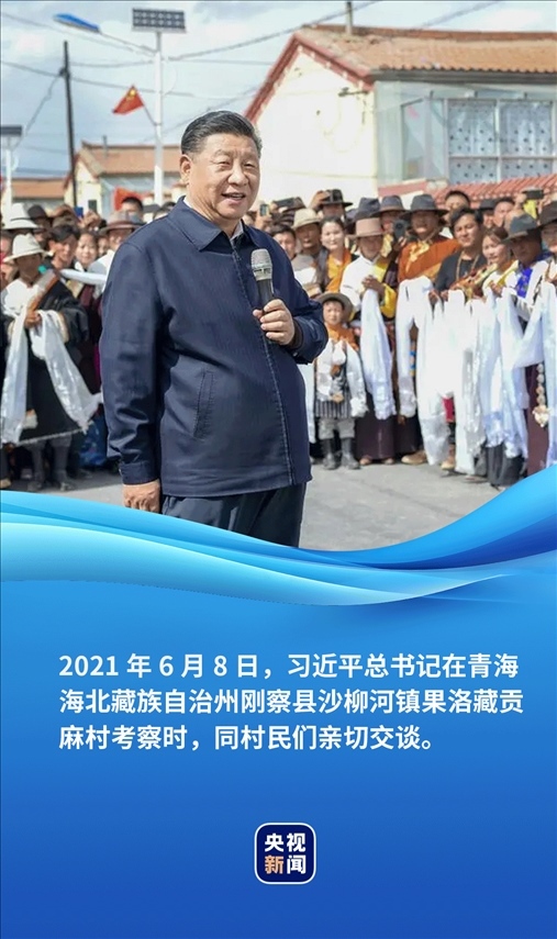 藍天白云下,一排排紅瓦黃墻的平房小院錯落有致,筆直整潔的村道兩旁立著太陽能路燈。村民索南才讓帶著一家三代站在家門口,向總書記獻上潔白的哈達。