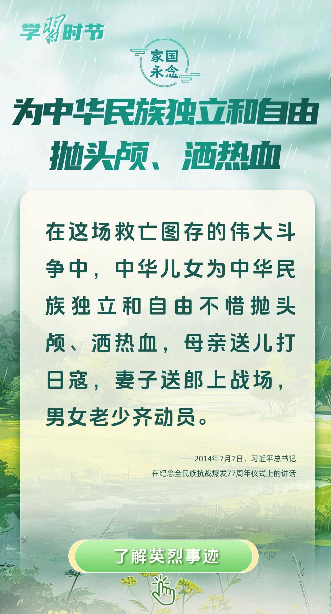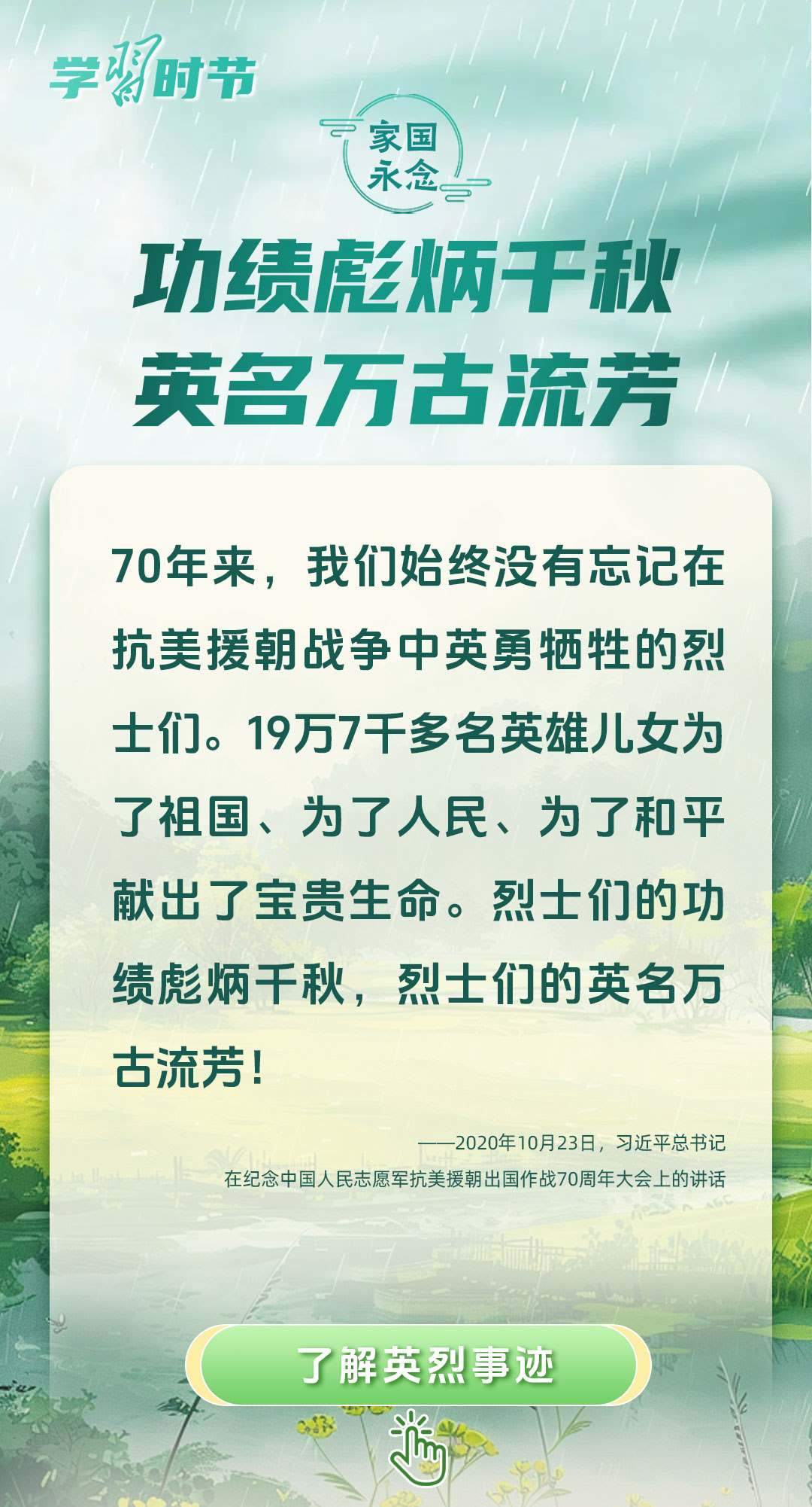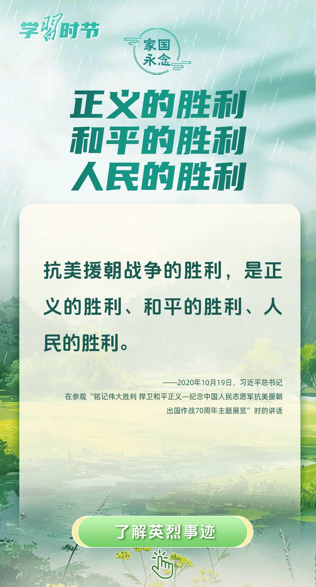 今年是中國人民抗日戰(zhàn)爭暨世界反法西斯戰(zhàn)爭勝利80周年、中國人民志愿軍抗美援朝出國作戰(zhàn)75周年。習(xí)近平總書記曾說:“對一切為國家、為民族、為和平付出寶貴生命的人們,不管時代怎樣變化,我們都要永遠(yuǎn)銘記他們的犧牲和奉獻(xiàn)?!苯裉煳覀兯鶕碛械囊磺?,無不凝結(jié)著英雄、英烈們的奉獻(xiàn)付出乃至巨大犧牲。