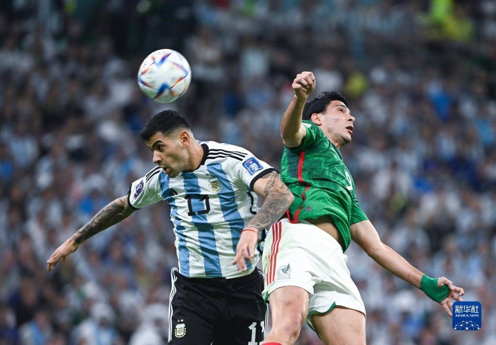 11月26日,阿根廷隊(duì)球員克·羅梅羅(左)和墨西哥隊(duì)球員勞爾·希門(mén)尼斯在比賽中爭(zhēng)頂。新華社記者 李尕 攝