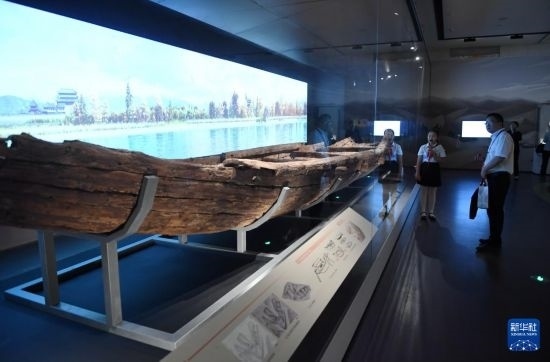 5月18日,觀眾在陜西歷史博物館秦漢館觀看“天下同一——秦漢文明主題展”上展出的漢代古船“絲路一號(hào)”。