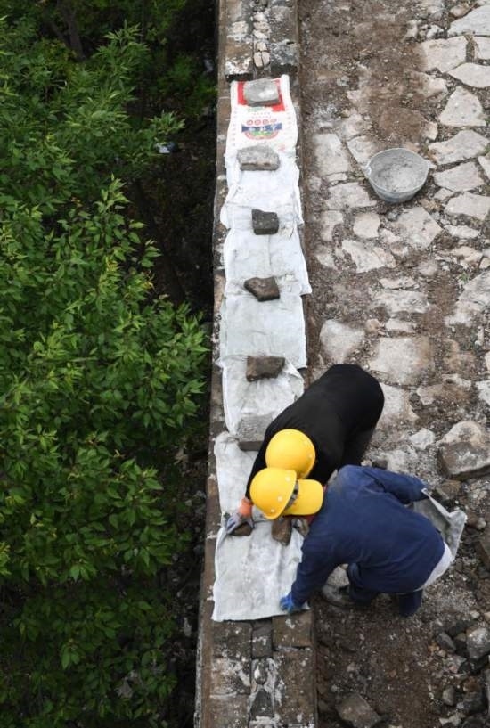 在箭扣長城122號(hào)敵臺(tái)東側(cè)墻體,工人給剛剛砌好的磚蓋上編織袋遮雨(7月2日攝)。新華社記者 陳鐘昊 攝