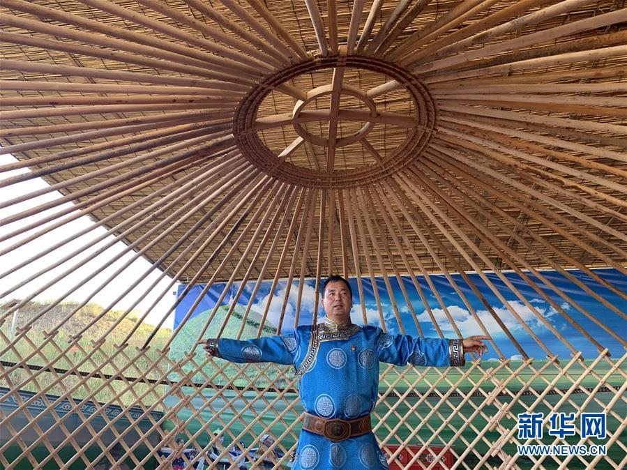 7月17日,布仁巴雅爾在展示編織完成的蒙古包圍壁。新華社記者 王靖 攝