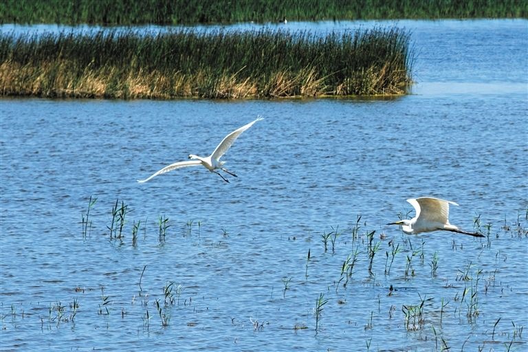 鳥(niǎo)兒在烏梁素海自由翱翔。