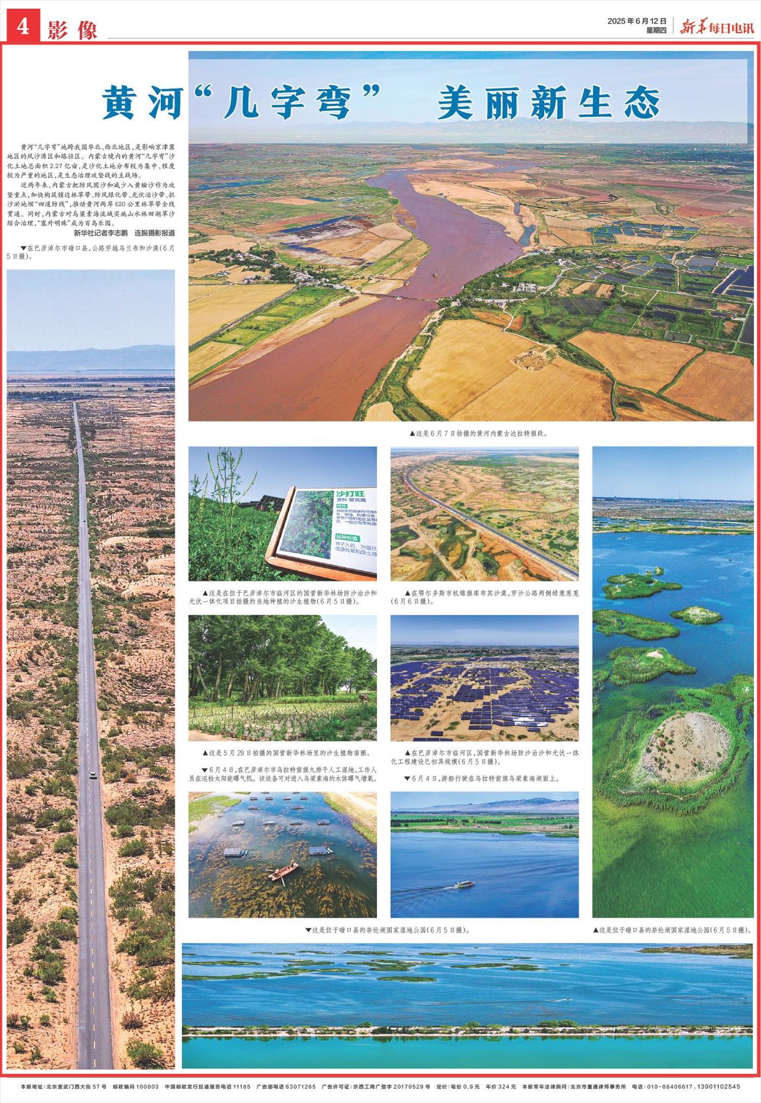 2025年6月12日,《新華每日電訊》第4版刊發(fā)題為《黃河“幾字彎” 美麗新生態(tài)》一文,報(bào)道了黃河“幾字彎”地跨我國(guó)華北、西北地區(qū),是影響京津冀地區(qū)的風(fēng)沙源區(qū)和路徑區(qū)。內(nèi)蒙古加快構(gòu)筑鎖邊林草帶、防風(fēng)綠化帶、光伏治沙帶、攔沙淤地壩“四道防線(xiàn)”,推動(dòng)黃河兩岸620公里林草帶全線(xiàn)貫通。