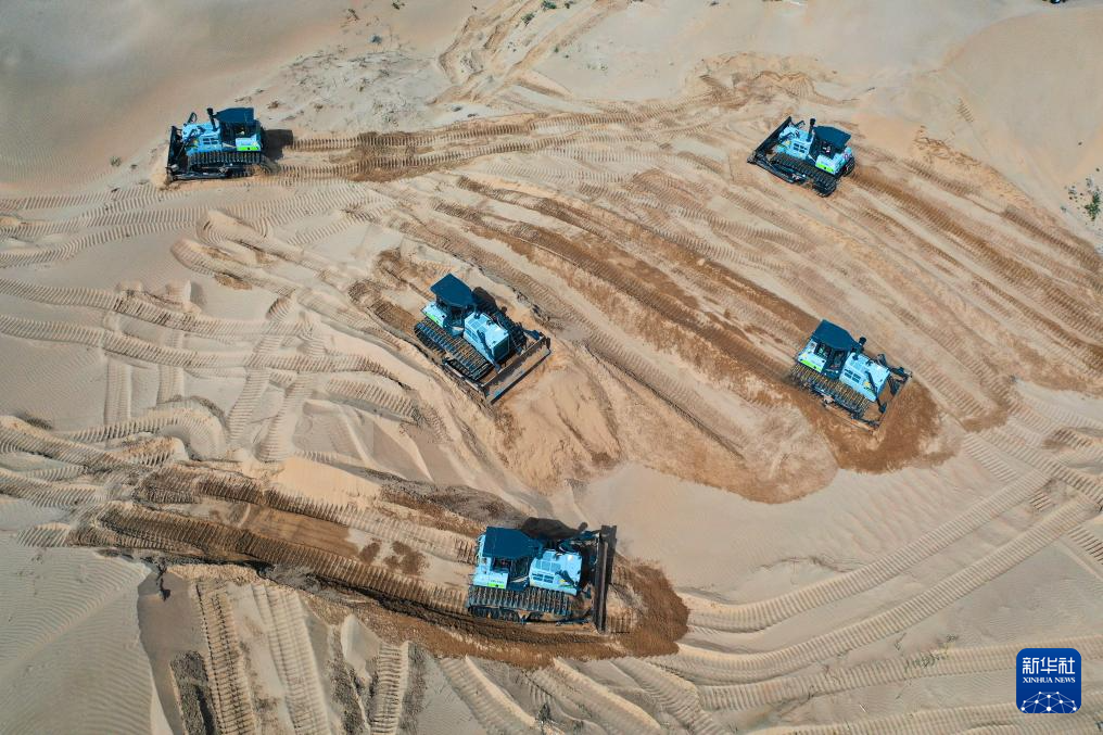 6月7日,在鄂爾多斯市達(dá)拉特旗境內(nèi)的庫(kù)布其沙漠,工程機(jī)械在平整沙地、開(kāi)展光伏治沙工程建設(shè)(無(wú)人機(jī)照片)新華社記者 李志鵬 攝