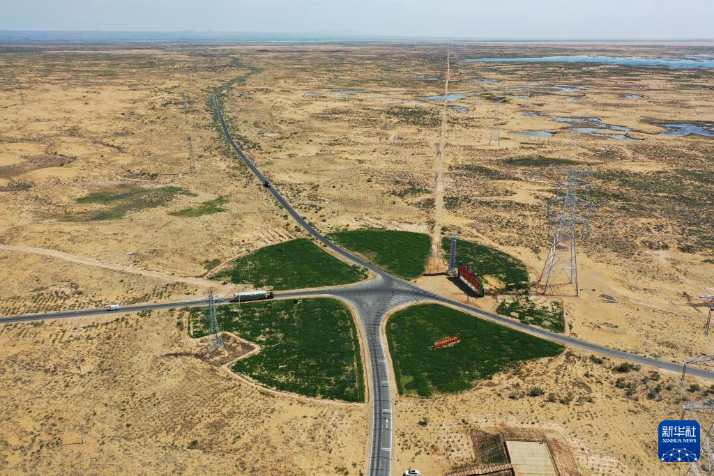 在巴彥淖爾市磴口縣,公路穿越烏蘭布和沙漠(6月5日攝,無(wú)人機(jī)照片)新華社記者 連振 攝
