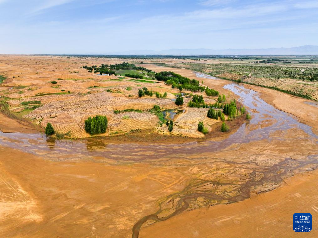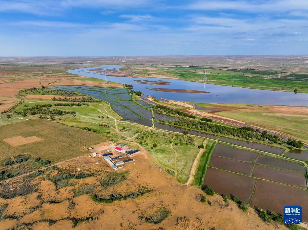 在巴彥淖爾市磴口縣劉拐沙頭,黃河蜿蜒而過(guò)(6月5日攝,無(wú)人機(jī)照片)新華社記者 連振 攝