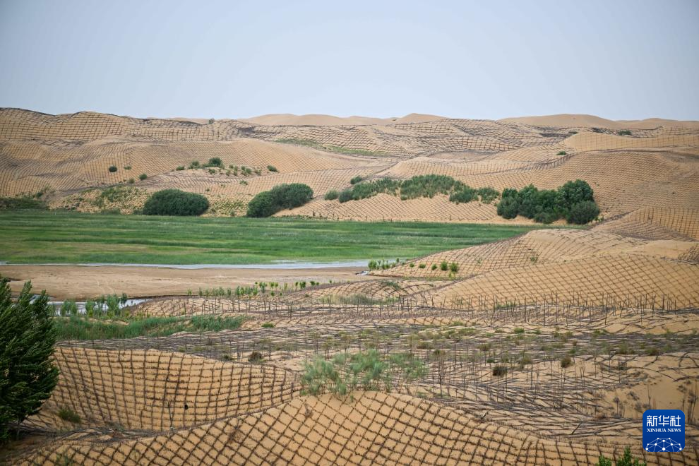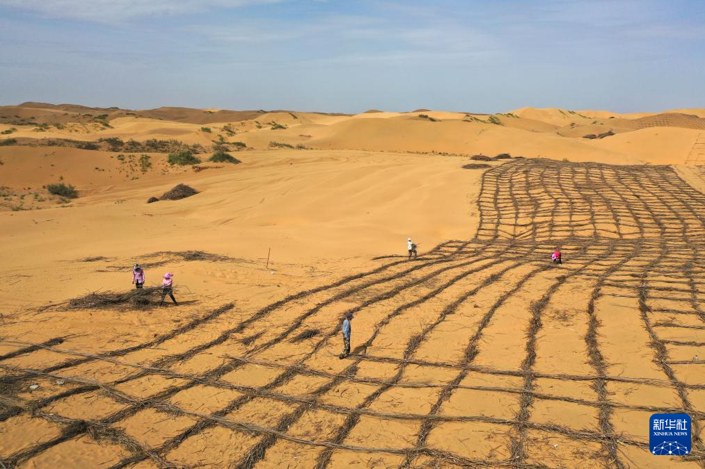 6月7日,在鄂爾多斯市達(dá)拉特旗境內(nèi)的庫(kù)布其沙漠,工人在治沙 新華社記者 李志鵬 攝