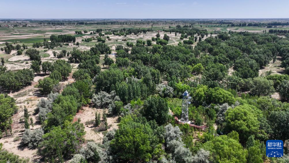 這是6月5日在巴彥淖爾市臨河區(qū)拍攝的郁郁蔥蔥的國(guó)營(yíng)新華林場(chǎng)(無(wú)人機(jī)照片)新華社記者 連振 攝