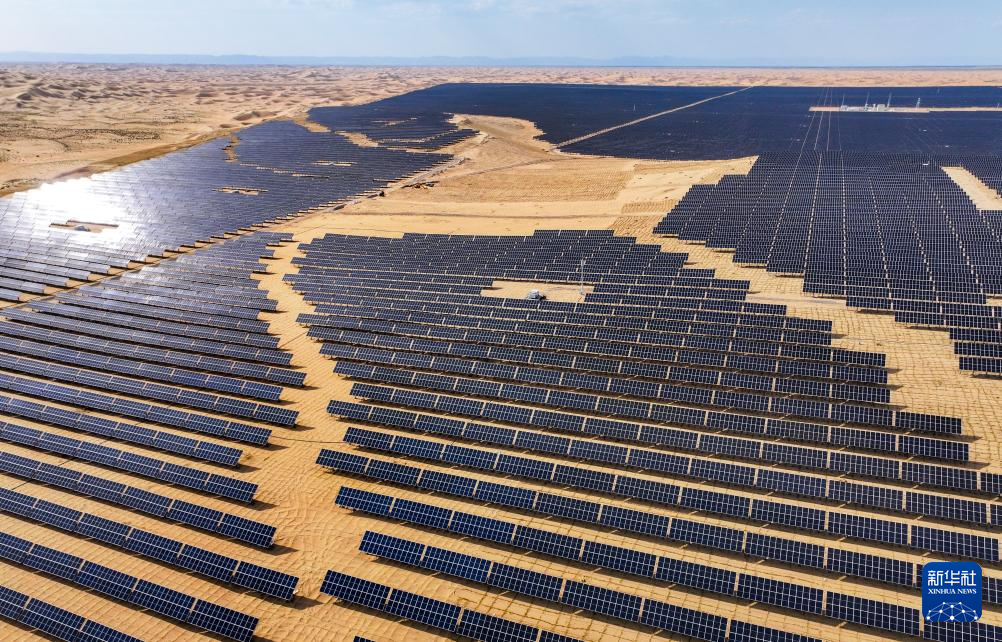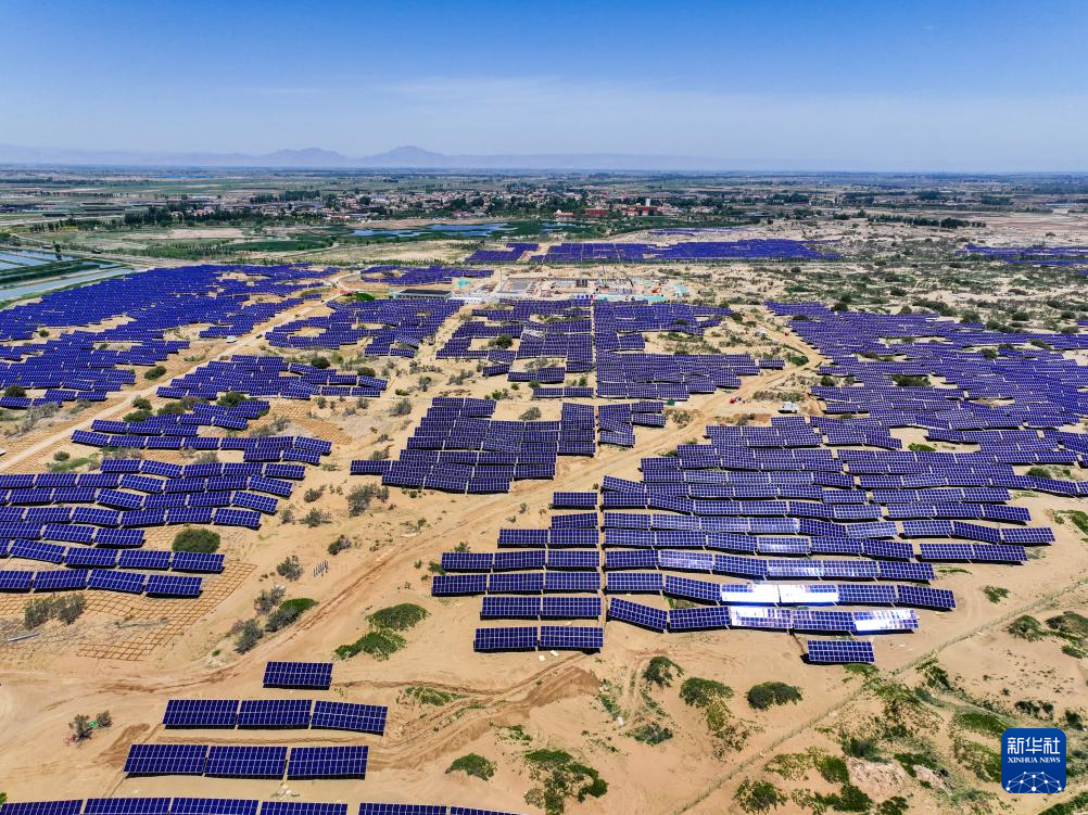這是6月5日拍攝的位于巴彥淖爾市磴口縣的烏蘭布和東北部新能源基地100萬(wàn)千瓦光伏先導(dǎo)工程項(xiàng)目,該項(xiàng)目地處烏蘭布和沙漠(無(wú)人機(jī)照片)新華社記者 連振 攝