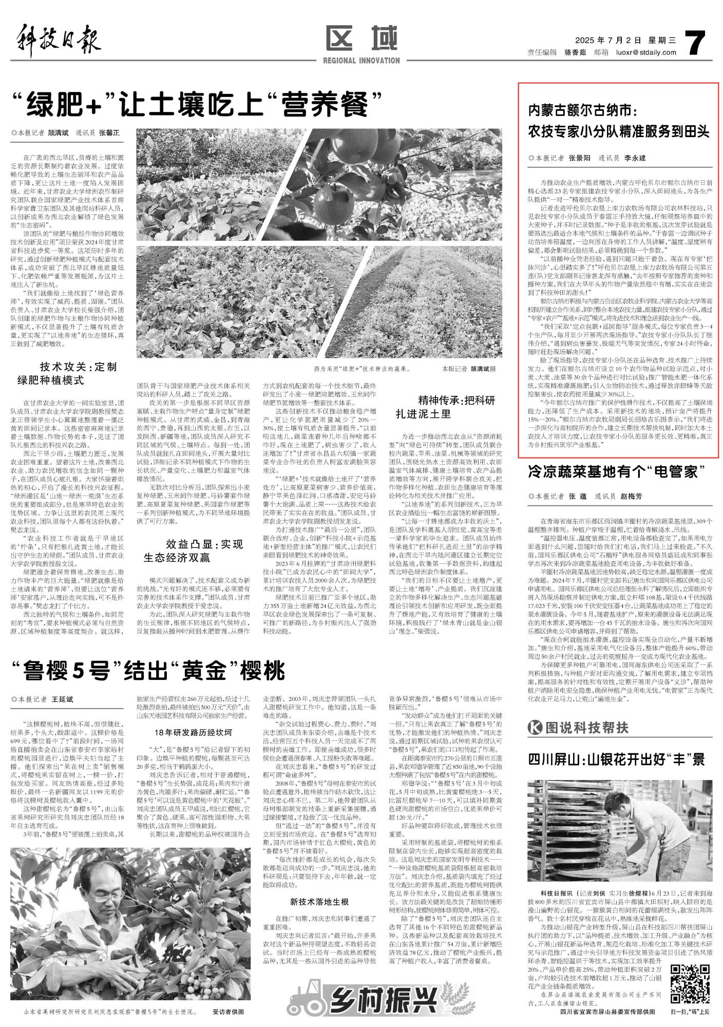 2025年7月2日《科技日報》第7版刊發(fā)了《內(nèi)蒙古額爾古納市:農(nóng)技專家小分隊精準服務到田頭》的文章,報道了內(nèi)蒙古呼倫貝爾市額爾古納市積極與內(nèi)蒙古自治區(qū)農(nóng)牧業(yè)科學院、內(nèi)蒙古農(nóng)業(yè)大學等高校院所建立合作關系,同時整合本地農(nóng)技力量,組建農(nóng)技專家小分隊,通過“專家+農(nóng)戶”“基地+示范”模式,將先進技術和理念送到農(nóng)業(yè)生產(chǎn)一線。