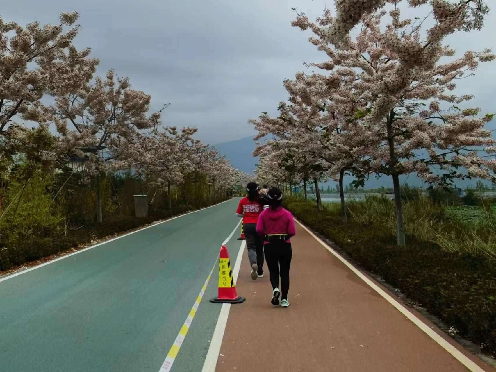 人民網(wǎng)黨委委員、監(jiān)事會主席唐維紅參加了此次半程馬拉松。完賽后,她總結(jié)此賽事的特點有“三美”——美在賽道。湖靜謐、山秀美,粉的神黃豆花、紅的三角梅、藍的百子蓮、藍花楹……爭相斗艷,跑在山水間,一步一風景!