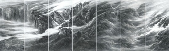 來自上海并深受海派畫學(xué)影響的樂震文、張弛,在宋元及明清山水畫學(xué)上打下了深厚的功底,也因此,他們的傳統(tǒng)山水畫深受日本民眾的歡迎。他們曾游居?xùn)|瀛多年,轉(zhuǎn)道再度研習(xí)了中國傳統(tǒng)文人畫。但真正改變他們畫風(fēng)的,卻是他們對中國北方大山大水的寫生攬勝。他們鐘情于英雄的太行山,忘情于革命勝地陜北高原,力求通過壯闊雄渾的山巒、連綿逶迤的群峰來表達他們的時代感悟,營構(gòu)儲存于他們胸中的山川氣象。所謂“山河回聲”,正是這些作品抒發(fā)的中華民族歷經(jīng)歲月風(fēng)華在大好河山之中回響的奮斗激情。