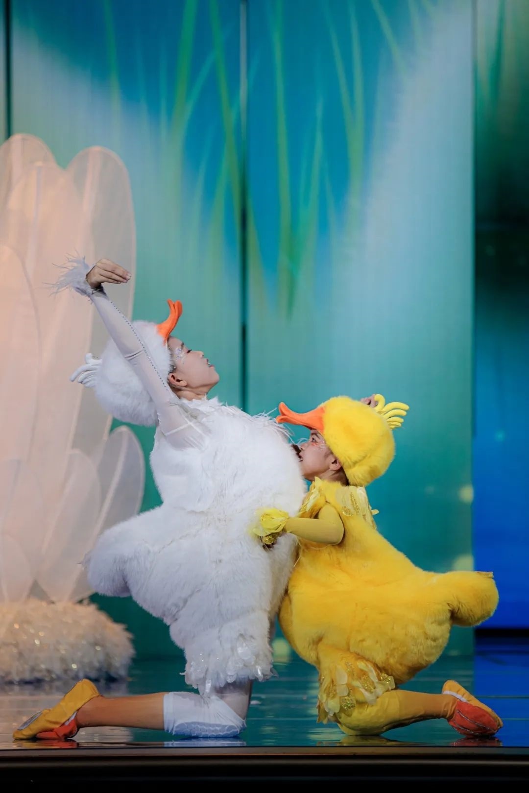 在初始版本中只有“小白鵝”,總臺(tái)臺(tái)長(zhǎng)提出要把孩子們的憨態(tài)可掬呈現(xiàn)得更極致一些,要有幽默感、有劇情感,并建議增加一只“搗亂”的“小黃鴨”。經(jīng)過重新編排,舞蹈一下子有了更多靈氣,“小黃鴨”穿梭在大小白鵝之中,不僅讓整體清冷的色調(diào)增加了一抹暖色,還讓舞蹈內(nèi)容更加豐富,童趣更加飽滿。