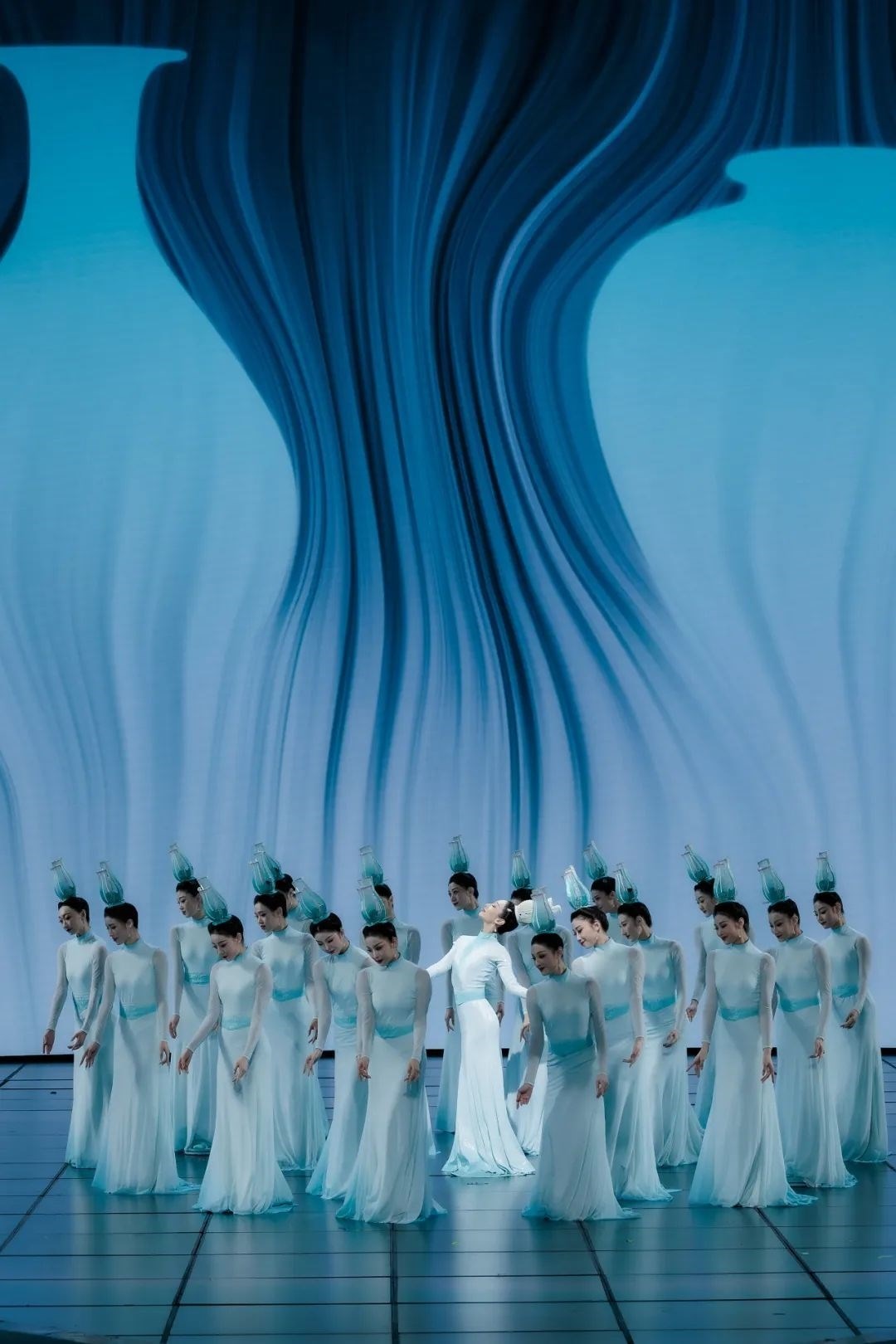 《瓷影》正是以青白瓷為視覺出發(fā)點(diǎn),演出服裝在色彩上著墨,提取“青”“白”這兩種傳統(tǒng)“正色”,展現(xiàn)出大繁若簡(jiǎn)的東方美學(xué)。通過舞者的肢體語(yǔ)言展現(xiàn)青白瓷跨越千年的獨(dú)特魅力。