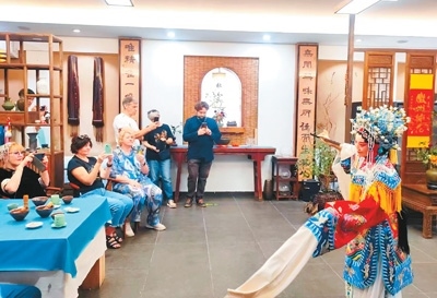 外國(guó)游客在黃山屯蒙學(xué)舍體驗(yàn)徽劇文化。