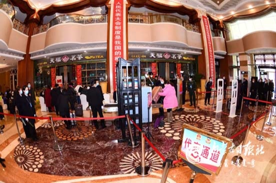出席會議的人大代表正在通過安檢進(jìn)入駐地。
